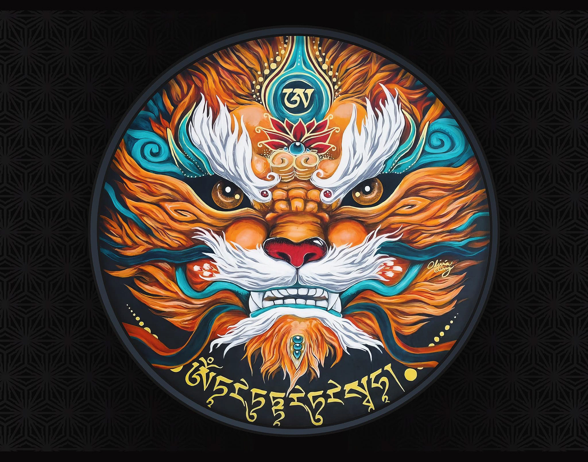 The Tibetan “AH” rests at his third eye, symbolizing the unborn, undying essence of awareness. Below, the Green Tara mantra invokes mercy amidst fire.